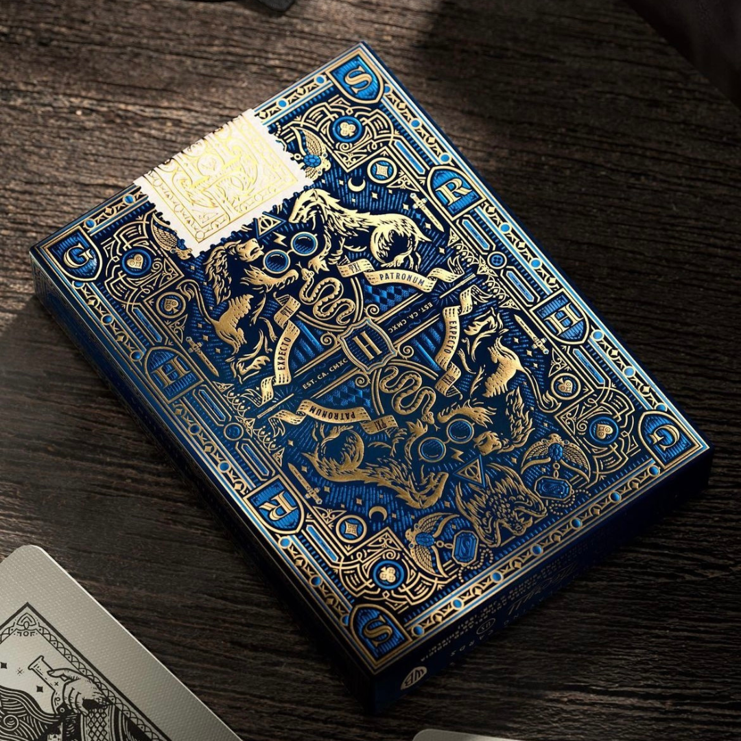 The cards are housed in a box with gold foil and house-coloured foil accents. The detailed embossing is a delight from every angle.